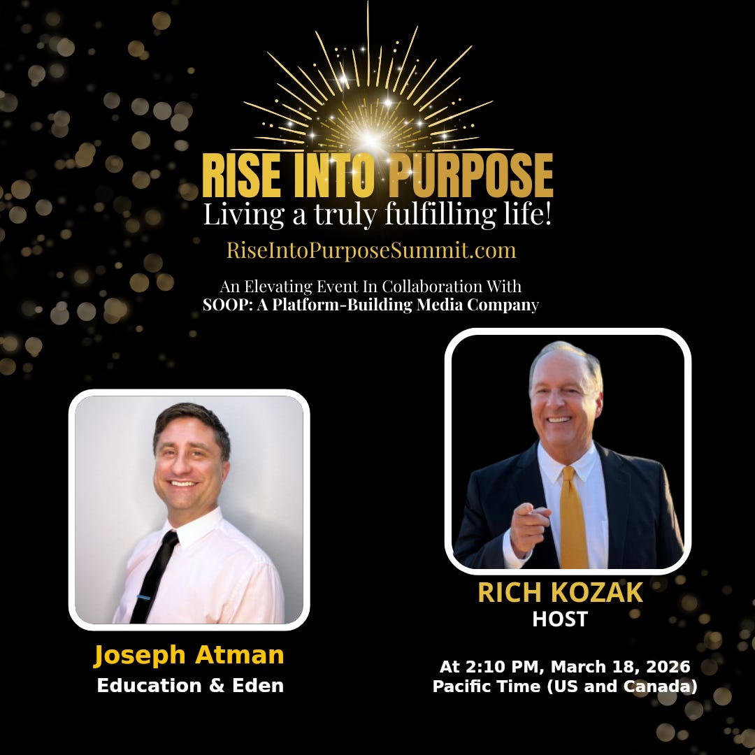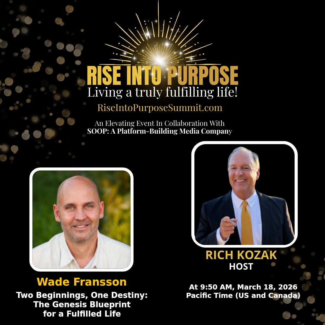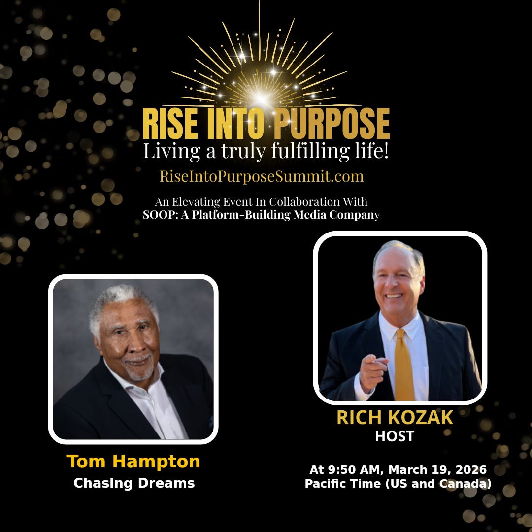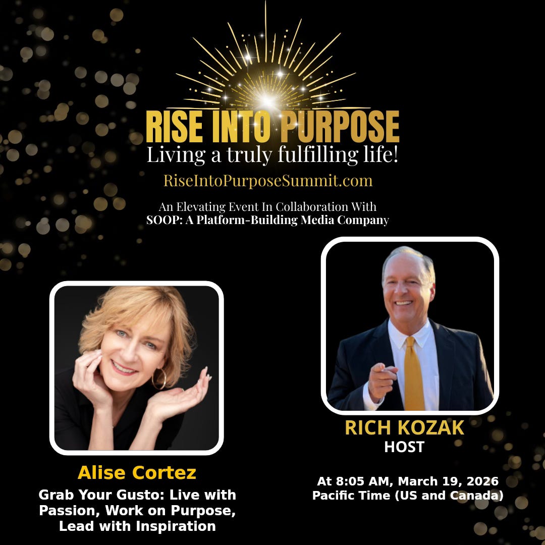 We’re sending out a special article on behalf of the Rise into Purpose Summit with Rich Kozak. We’ve partnered with them to help create this amazing 3-day summit featuring 24 speakers over three days. Four SOOP authors will be speaking, including Joseph Atman and Alise Cortez. Wade Fransson and Tom Hampton will be speaking too, which makes this an action-packed summit!
